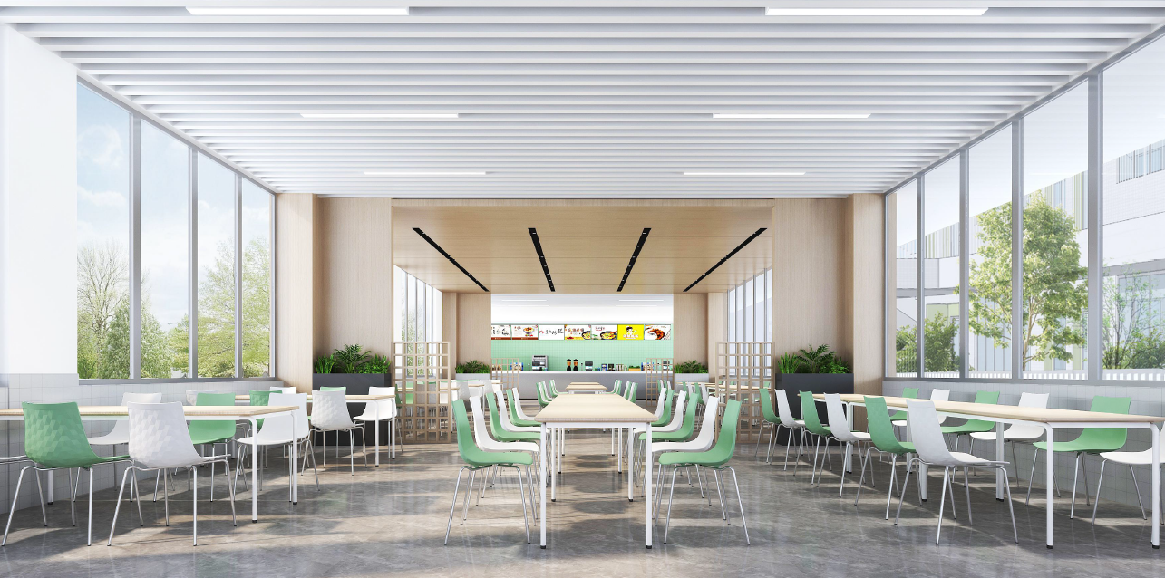 The cafeteria showcases light wood-finish panels paired with large-window views, creating an open and airy dining experience. Built with stain-resistant coatings, these panels withstand food spills and heavy use while maintaining a clean, modern look.