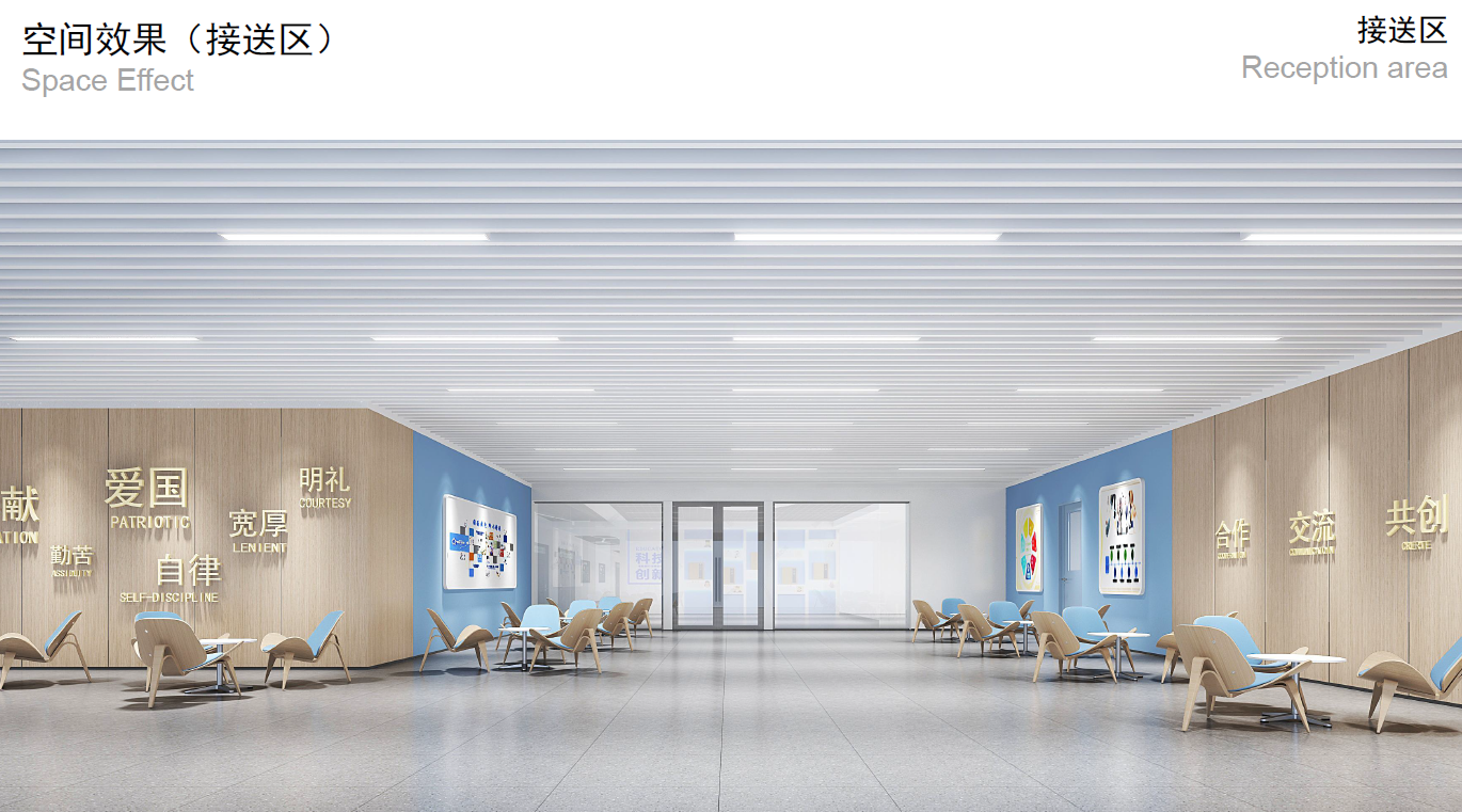 The school’s reception area features Pinger’s custom wall panels blending warm wood-textured finishes with subtle blue accents. Embedded with bilingual educational values (e.g., “Patriotism” and “Courtesy”), these panels serve as both decorative and educational elements. Engineered for durability, they resist daily wear and are easy to maintain, ensuring a lasting professional appearance.