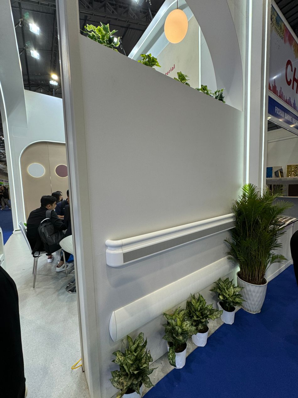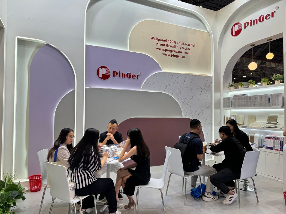Our exhibition area displayed an array of products, including the Wall panels System, Handrails System, and Corner Guards System. The neatly arranged product samples on the shelves allowed visitors to 直观地 (intuitively) experience the quality and variety of PinGer® products. Whether it was the antibacterial wall panels or the durable handrails, each item reflected our pursuit of excellence.