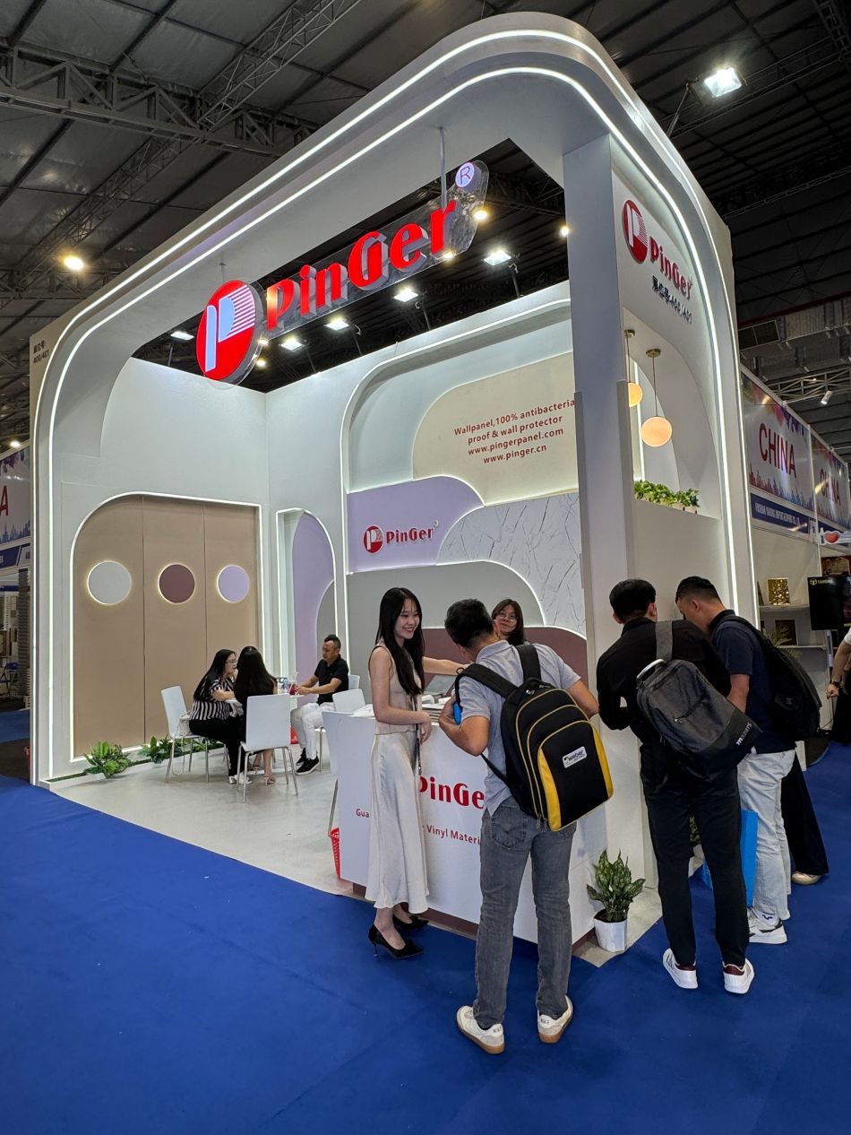In August 2024, PinGer® made a remarkable presence at the Vietnam Exhibition! Our booth, marked with the prominent “PinGer” logo and booth numbers 400/401, stood out in the exhibition hall. The modern and elegantly designed booth space showcased our diverse range of building materials and innovative solutions.